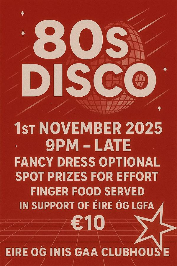 Following on from the success of last year’s 80s disco, another will be held at the clubhouse on Sat 1st November at 9pm. Fancy dress is optional with spot prizes for effort! Finger food on the night. All are most welcome to join us. Entry is €10 and all proceeds go to our ladies footballers.