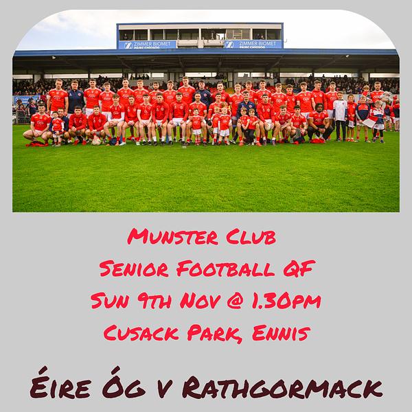 All hands on deck as our senior footballers take to the Munster Club stage this Sunday. Their quarter final tie v Rathgormack of Waterford throws in at 1.30pm in Cusack Park. Wishing the very best of luck to the team and management. Come on the Townies