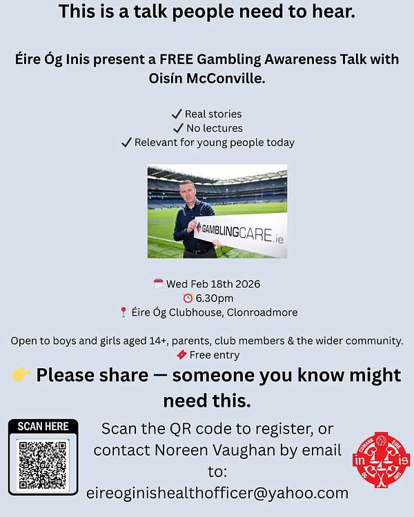 A reminder of the Gambling Awareness talk next Wednesday, Feb 18th at 6.30pm in the clubhouse. We would encourage in particular parents and their teenage children to attend and be proactive in perhaps preventing issues down the line. The talk should take no more than an hour and is free entry and open to members and the wider public.