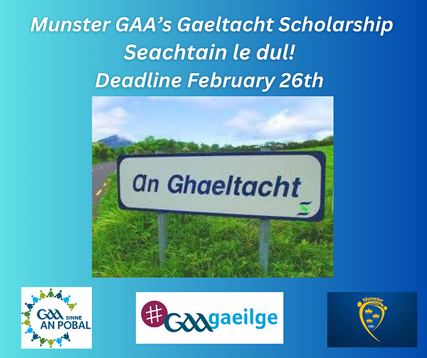 Munster GAA is delighted to announce that the 2026 Scholarship Competition for second-level students aged between 12 – 17 years, wishing to attend a Gaeltacht course this Summer is now open for applications. (minimum stay 2 weeks).