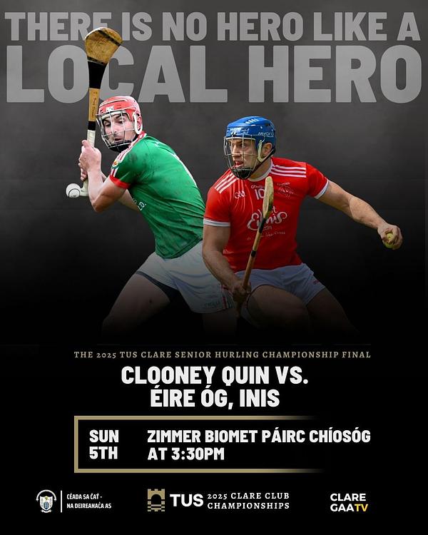 Clare GAA hosted an Up for the Final event on Thursday evening in Clareabbey. It was a great evening, with Syl O’Connor MC and guests Anthony Daly, Jamesie O’Connor, Éire Óg’s Stephen McNamara and Clooney Quin’s Pat Markham along with an audience from Éire Óg and Clooney Quin. You can watch back the event at this YouTube link: https://www.youtube.com/watch?v=VlUyy4Sq4Js